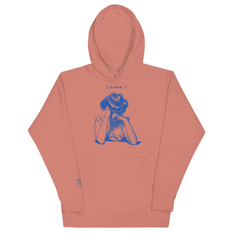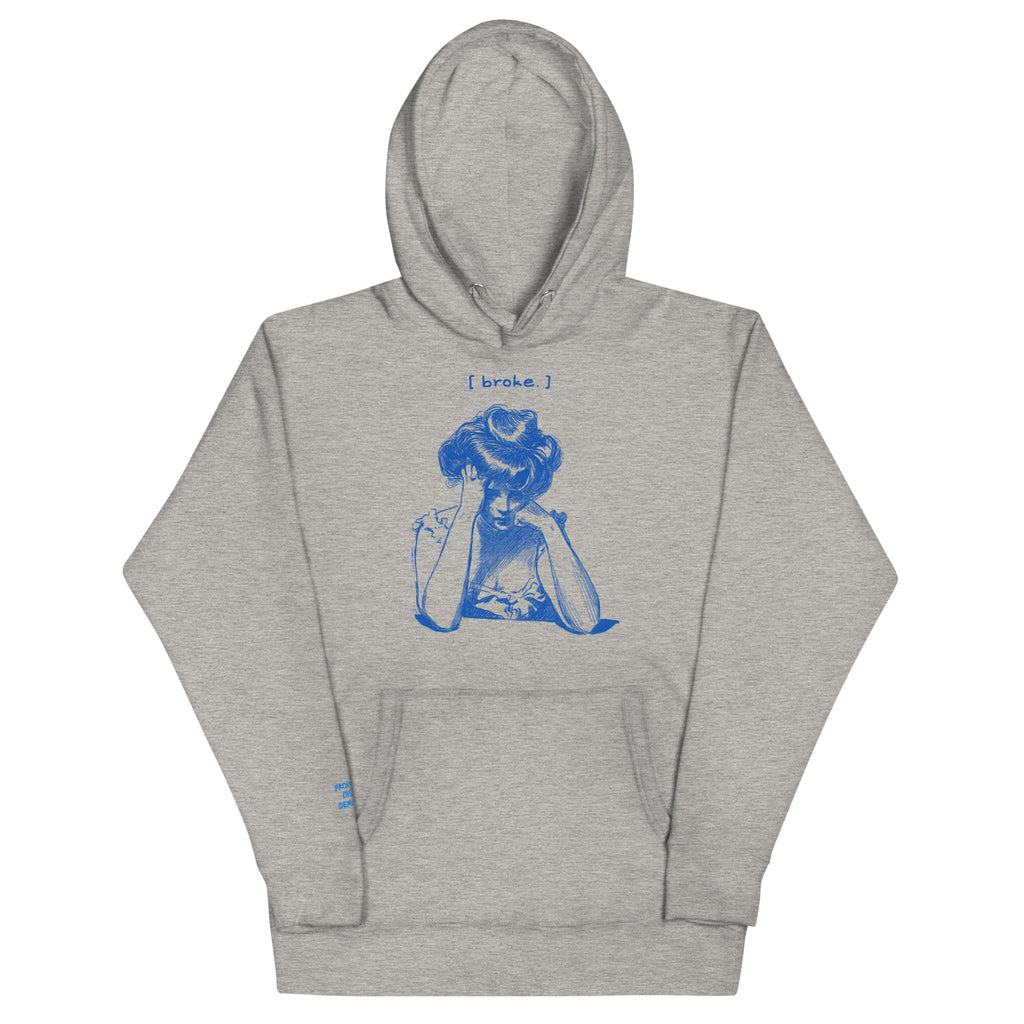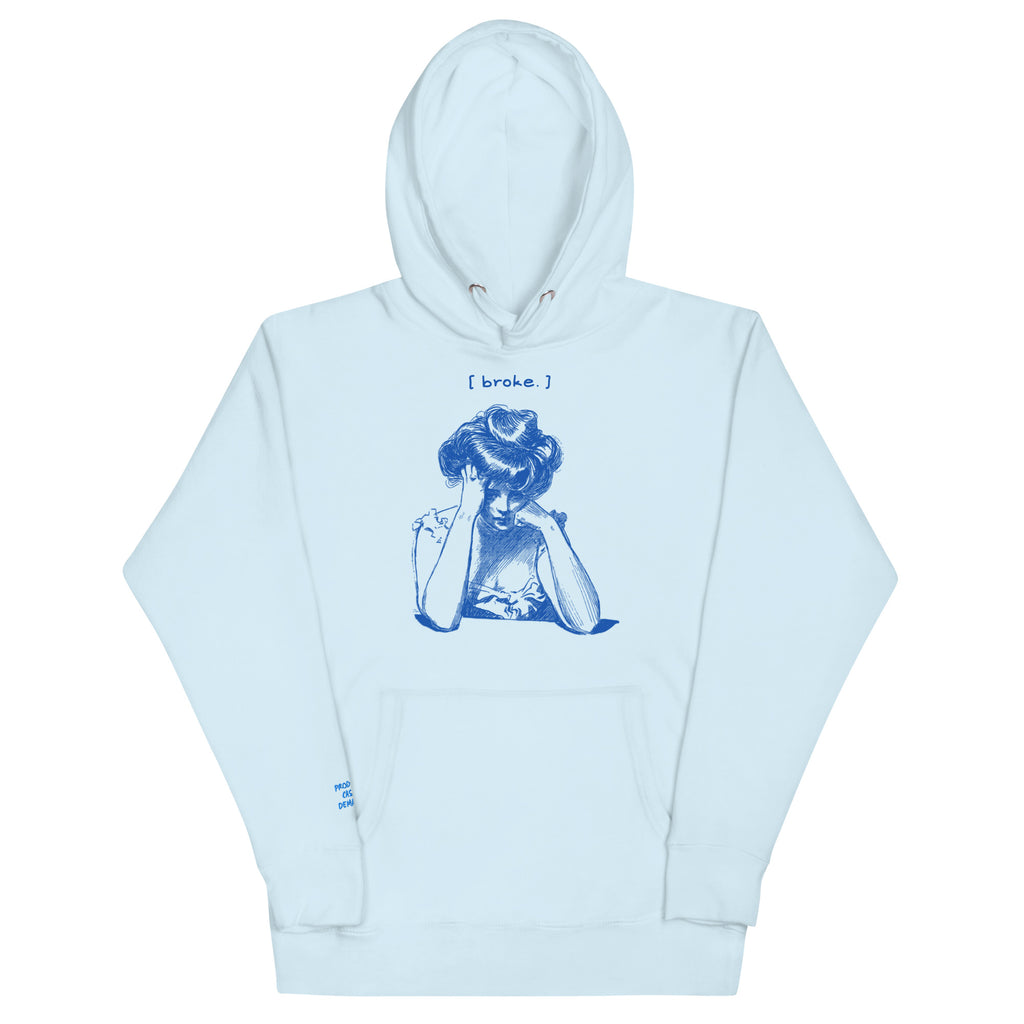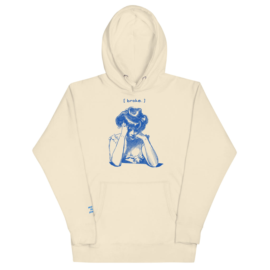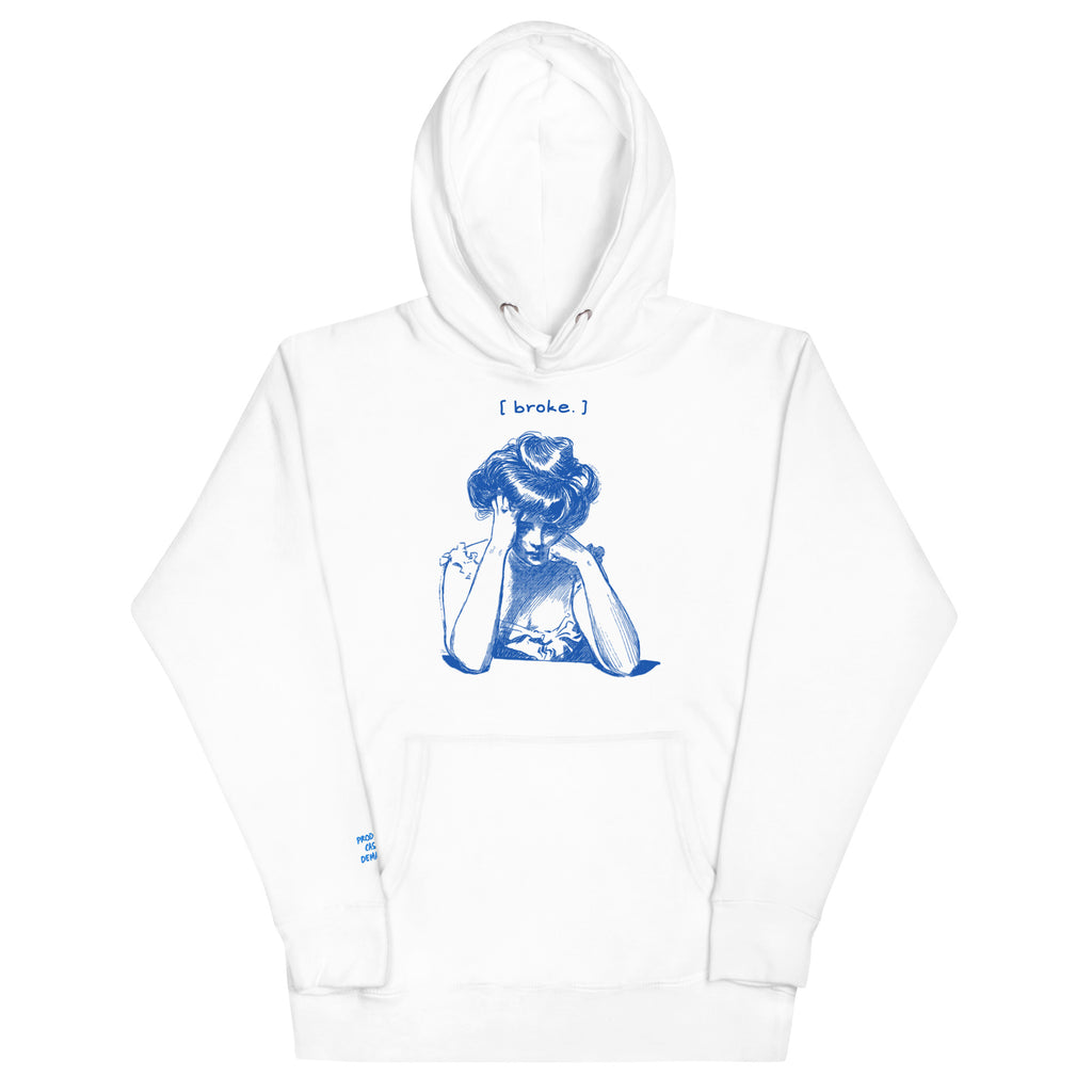 When the hustle hurts. This crisp white hoodie tells the story of every creative grinding between paydays. Featuring a retro sketch of a woman stressed over bills and the caption "[ broke. ]"—this one's for the real ones still figuring it out.